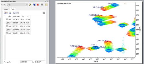 Automatic peak movement tracking and measurement of chemical shift perturbations (CSPs), fitting them to the concentrations of ligands to compute Kd.