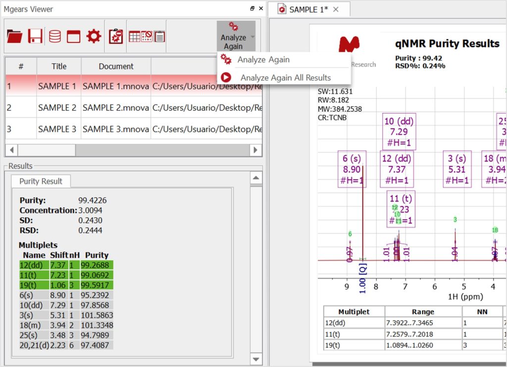Experience how easy it is to visualize and review results in Mnova with the Mgears Results.