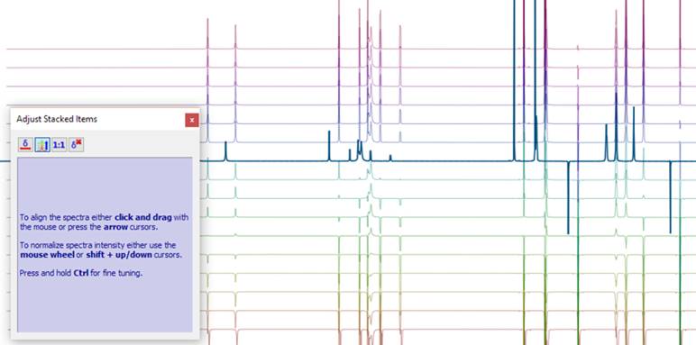 The superimposition and stacking functionality does not only apply to experimental spectra. Providing should you have a license for the NMRPredict Desktop plugin, you can use it to easily compare experimental with predicted spectra, to validate your structure hypothesis.