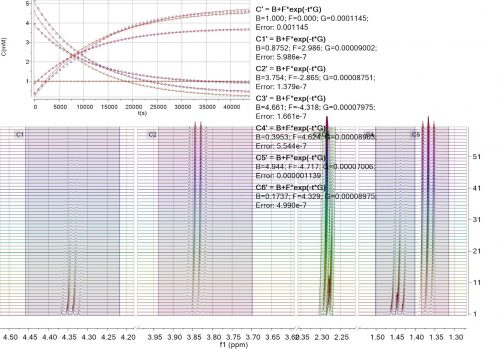 Mnova incorporates a ‘Data Analysis’ feature for the analysis of an array of 1D NMR experiments. It has the ability to handle multiple series, for example it’s possible to analyse the decay of several resonances within the same experiment, or a series of peak shifts during a titration.