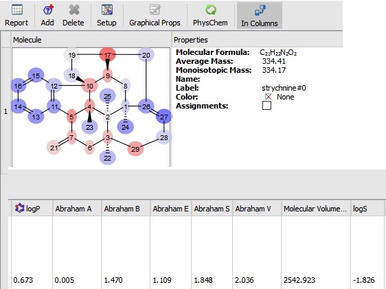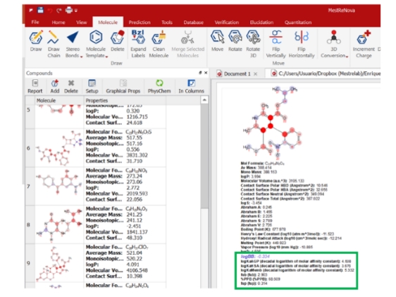 A new proprietary fragmentation method and statistical validation to derive explanatory and predictive QSPR models. Obtain a wide range of physic-chemical property predictions for your studies all within your Mnova application. Includes model building capabilities! If you have data of a particular property you are interested in, we can build a model for you. Clear warning messages when the prediction is outside of the predictive model. Display the atom by atom contribution to each of the properties in a simple manner. |