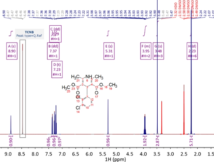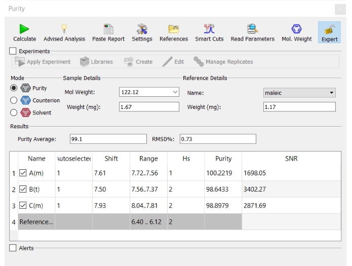 Optimised tool to obtain your Purity results in one single click using the ‘Advised Analysis’ button. This feature firstly will find your parameters (molecular weight, sample weight, reference compound etc.) Then it will apply optimized settings to carry out the NMR analysis and finally calculate your compounds purity.