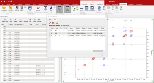 For NOEs, distances are easily calculated from measured cross-peak volumes with a single click.