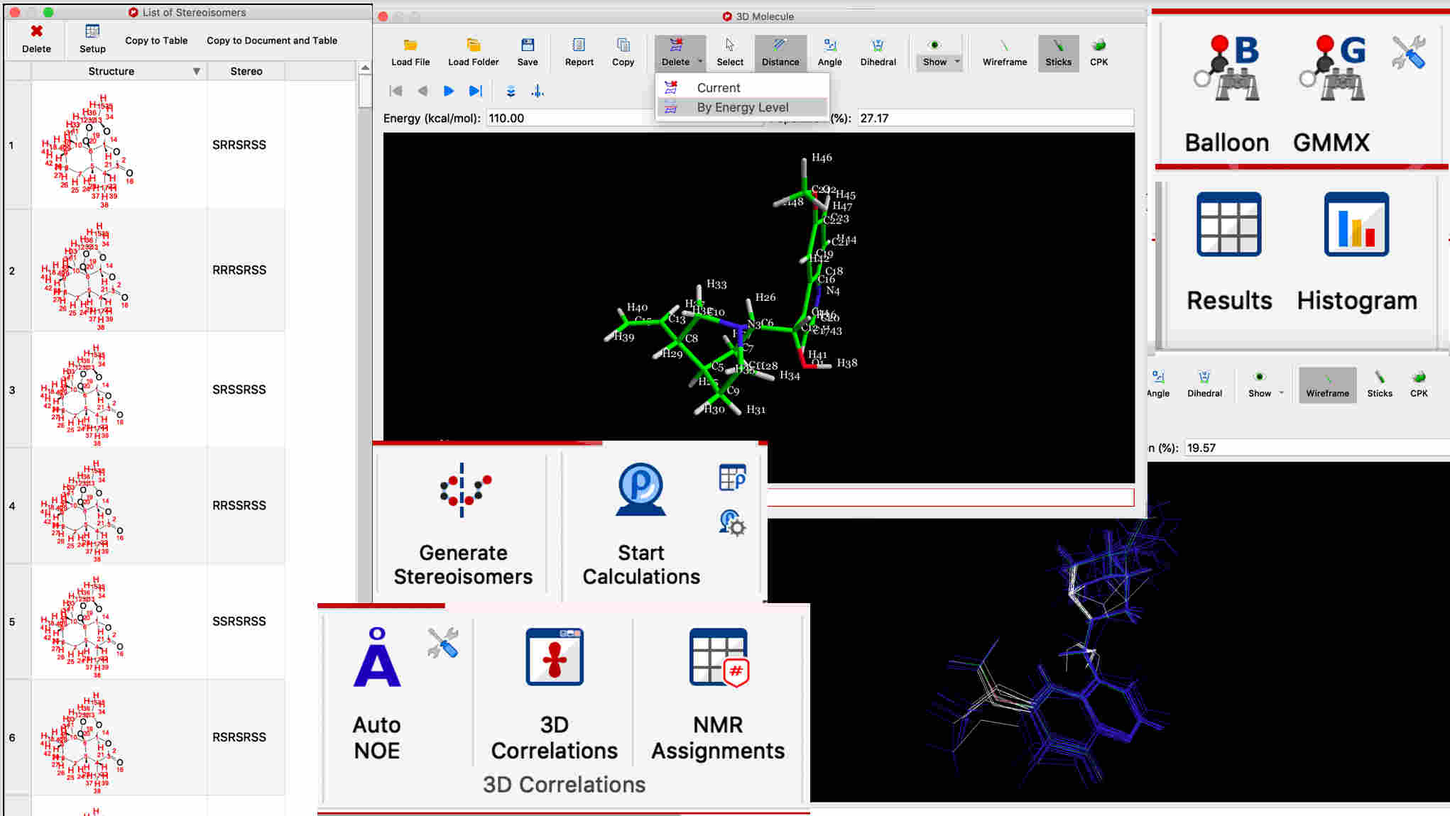 Sets of 3D conformations can be interactively viewed, aligned, overlayed, and filtered by energy level