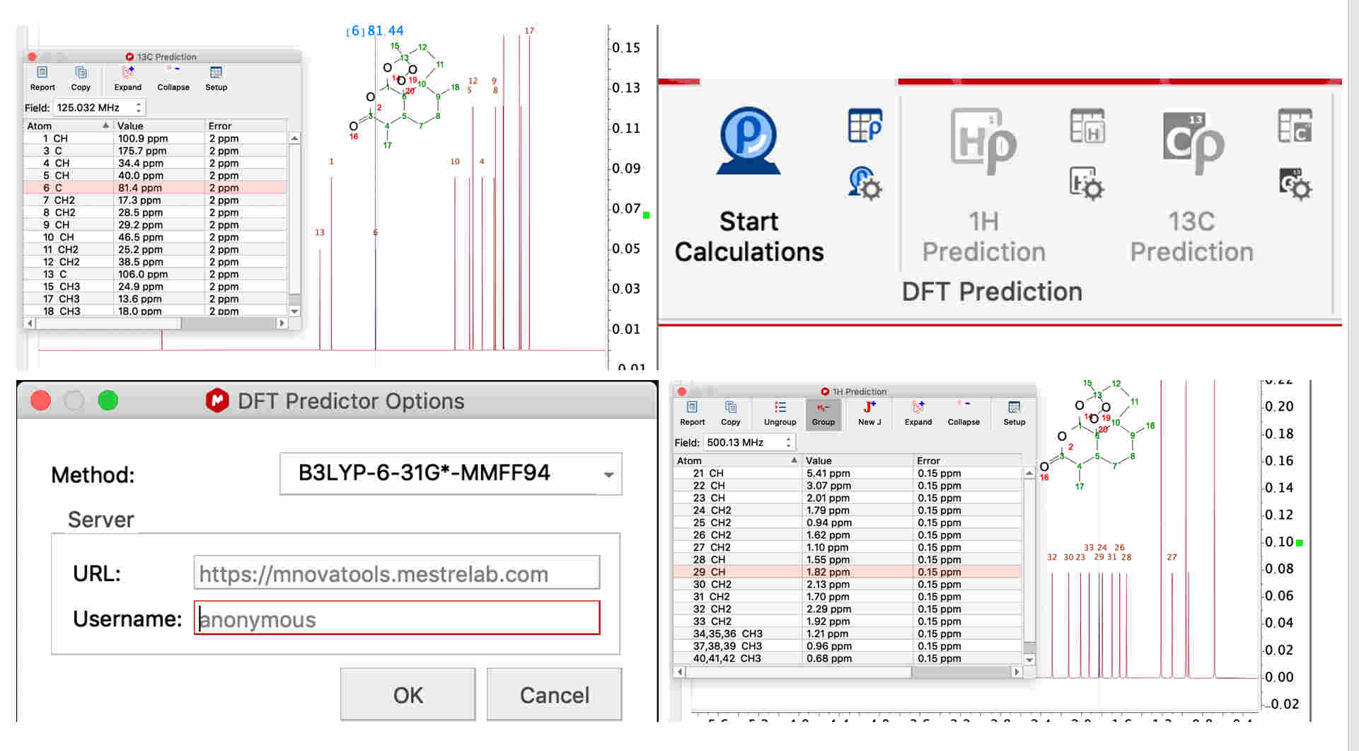 For chemical shift prediction, DFT calculations can be carried out within StereoFitter. A separate DFT Predictor license is required for running these calculations. The DFT Predictions section of the ribbon contains tools to predict 1H or 13C chemical shifts using results from a server-based DFT program.
