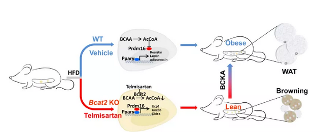 2022年1月24日,復旦大學雷群英、黃海艷和尹淼聯合在Nature Metabolism雜志發(fā)表了題為BCAA–BCKA axis regulates WAT browning through acetylation of PRDM16 研究文章,作者發(fā)現BCAT2(白色脂肪中代謝BCAA的關鍵酶)全脂肪特異敲除小鼠以及白色脂肪特異敲除小鼠能抵抗高脂誘導的肥胖,深入研究發(fā)現脂肪組織中敲除BCAT2減少了BCAA來源的Ac-CoA,造成Prdm16乙?;较陆?,從而增強轉錄因子Prdm16和Pparγ相互作用,促進了白色脂肪棕色化。進一步藥物篩選發(fā)現替米沙坦直接結合BCAT2來抑制BCAA代謝,從而抵抗高脂誘導的小鼠肥胖,為臨床藥物治療肥胖提供了思路。
