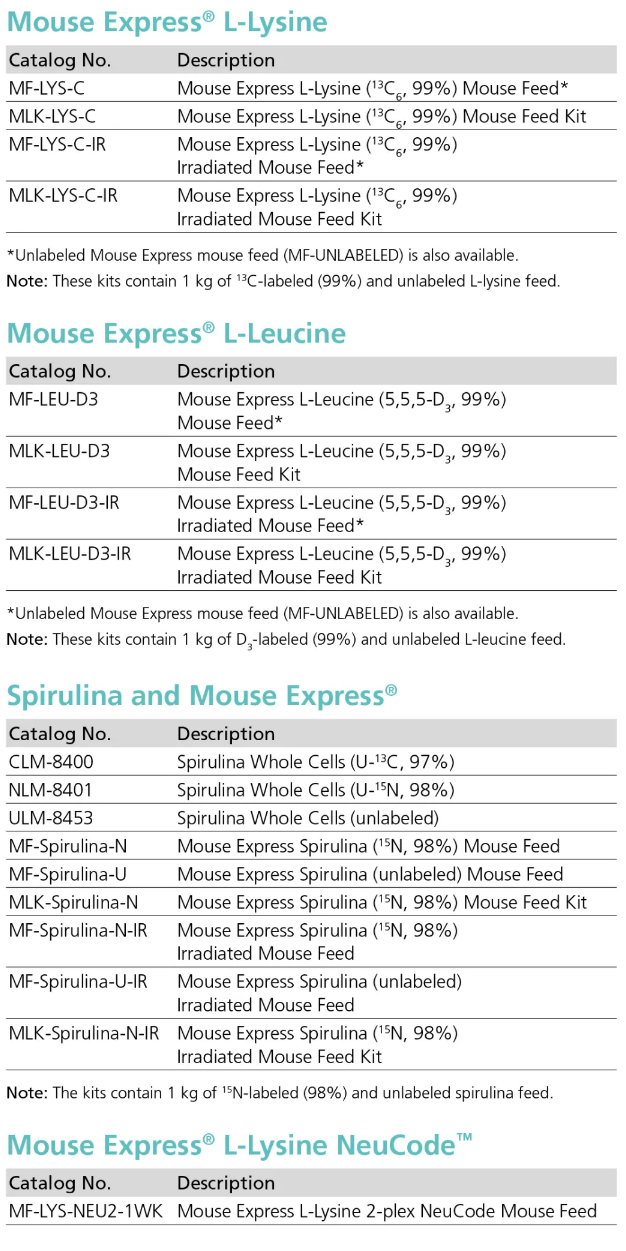 劍橋同位素實(shí)驗(yàn)室公司(CIL)提供標(biāo)記/未標(biāo)記飼料,用于將穩(wěn)定同位素或天然氨基酸代謝納入小鼠(或大鼠)體內(nèi),用于基于SILAM的質(zhì)譜研究。
