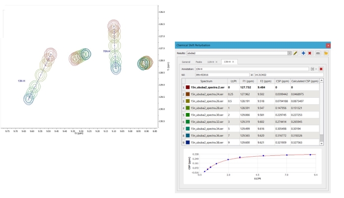 自動跟蹤和測量具有CSP的HSQC疊加譜圖。左圖顯示了兩個歸屬譜峰的移動。右側(cè)顯示了其中一個跟蹤峰“13C-H”的詳細信息,包括配體/蛋白質(zhì)的濃度比、任意維度的CSP測量值、歸一化CSP以及Kd的擬合結(jié)果和誤差。。