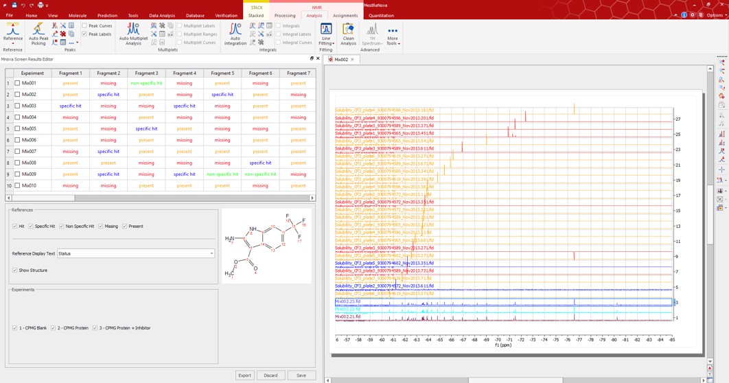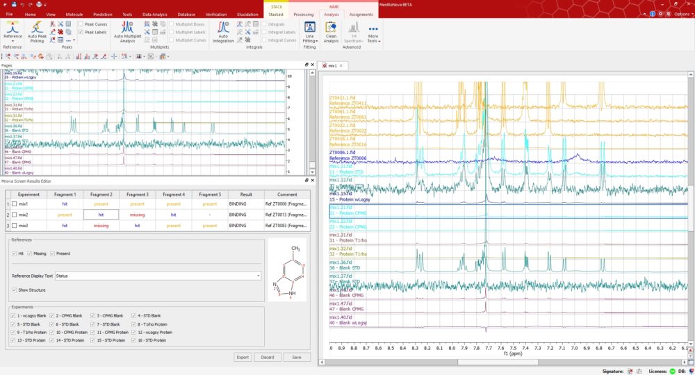 通過NMR進(jìn)行基于片段的藥物篩選的自動分析工具 Mnova Screen是簡單高效的工具,具有靈活的分析和報(bào)告功能,已被頂級制藥公司使用。Mnova Screen可以處理來自以下篩選實(shí)驗(yàn)的所有數(shù)據(jù): 1H或19F 單一化合物或混合物 有無參考譜圖 單一或多種類型的譜圖(STD、T1rho、Watergsy、CPMG) 使用Blank, w/ Protein, & w/ Protein+ Inhibitors 您可以在 Mnova Screen overview閱讀更多信息,還可以查看與Bruker合作舉辦的新網(wǎng)絡(luò)研討會 webinar。 > 獲取license |